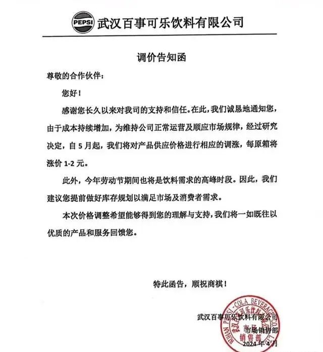 4月份,网络还流传了一份加盖了“武汉百事可乐饮料有限公司”公章的告知函,其中显示,“由于成本持续增加,为维持公司正常运营及顺应市场规律,经研究决定,自5月起,我们将对产品供应价格进行相应的调涨,每原箱将涨价1-2元”。