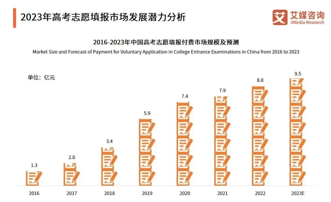 艾媒咨询发布的《2023年中国高考志愿填报及就业前景大数据分析报告》显示,2022年中国高考志愿填报市场付费规模达到了8.8亿元,相比2016年的1.3亿元增长了近6倍。
