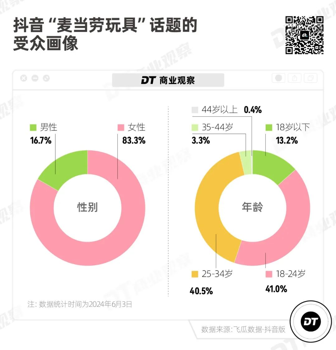 不出意外,在抖音“麦当劳玩具”的人群画像中,18-24岁和25-34岁的成年人是主要受众。
