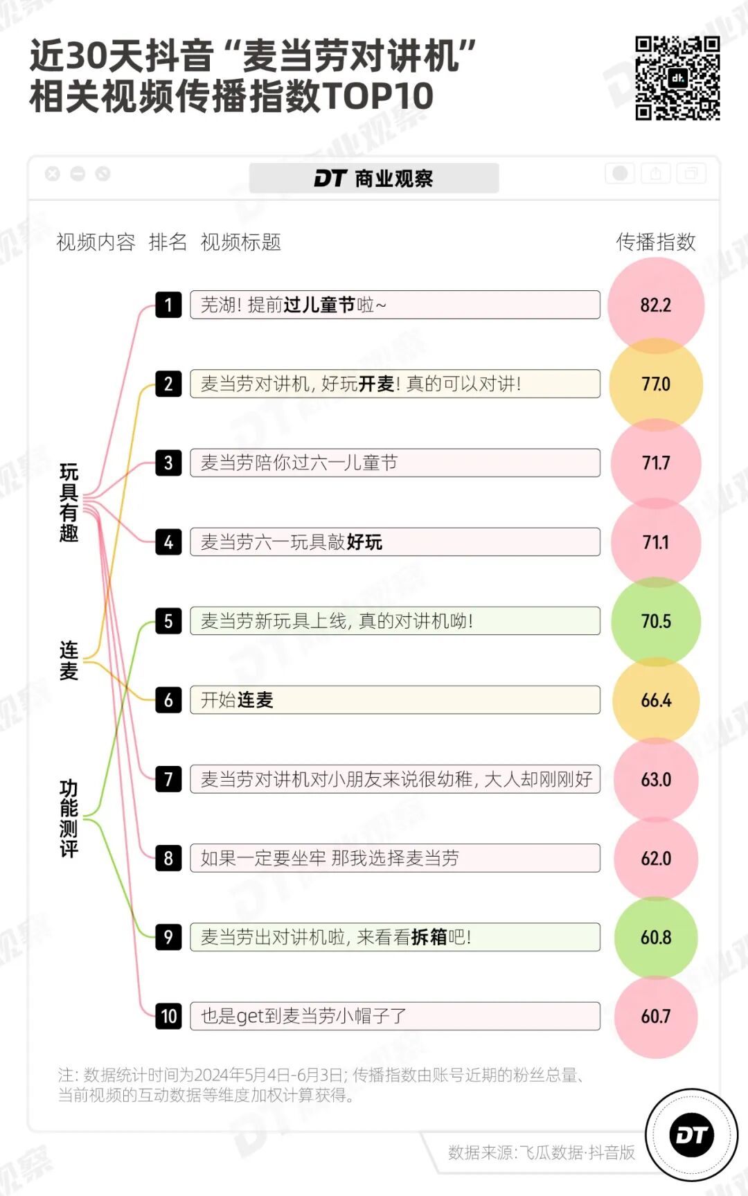 《DT商业观察》以“麦当劳玩具”为关键词,整理了近30天抖音热门视频TOP10,发现这些视频可以归结为两类。