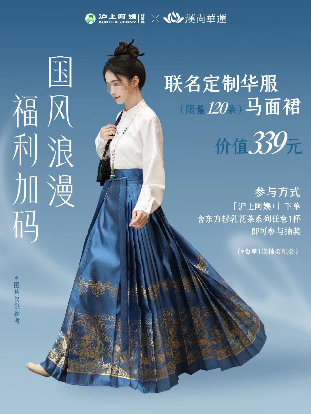 比如沪上阿姨跟马面裙联名,以马面裙为灵感,携手江永女书上新「东方轻乳花茶系列」,用年轻人喜闻乐见的方式,宣传中国马面裙文化。