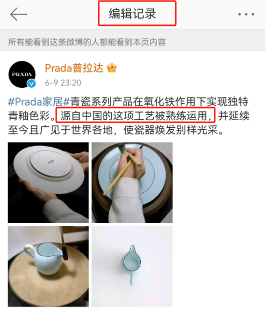 不仅搬出青瓷的介绍,还提醒Prada正确写法是MADE IN CHINA。