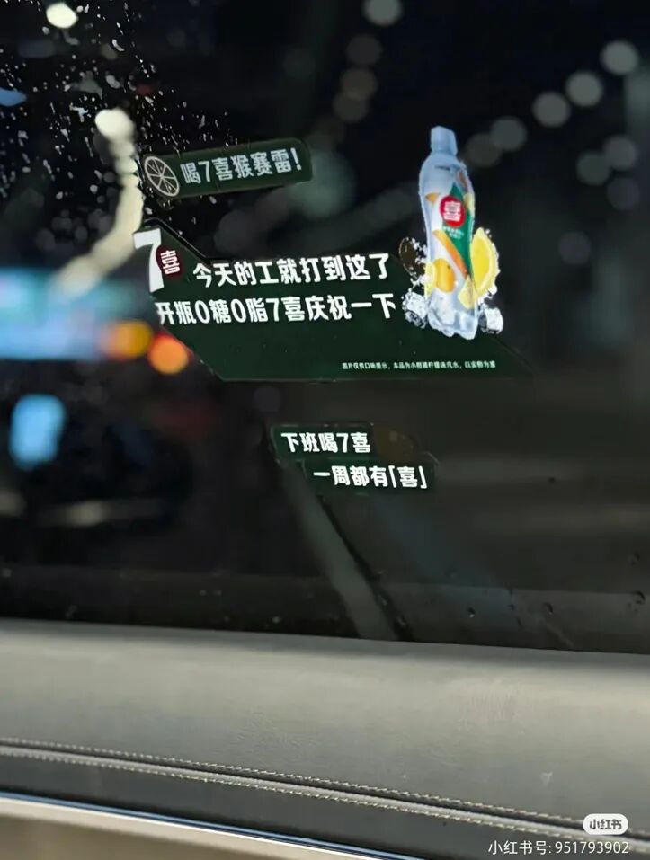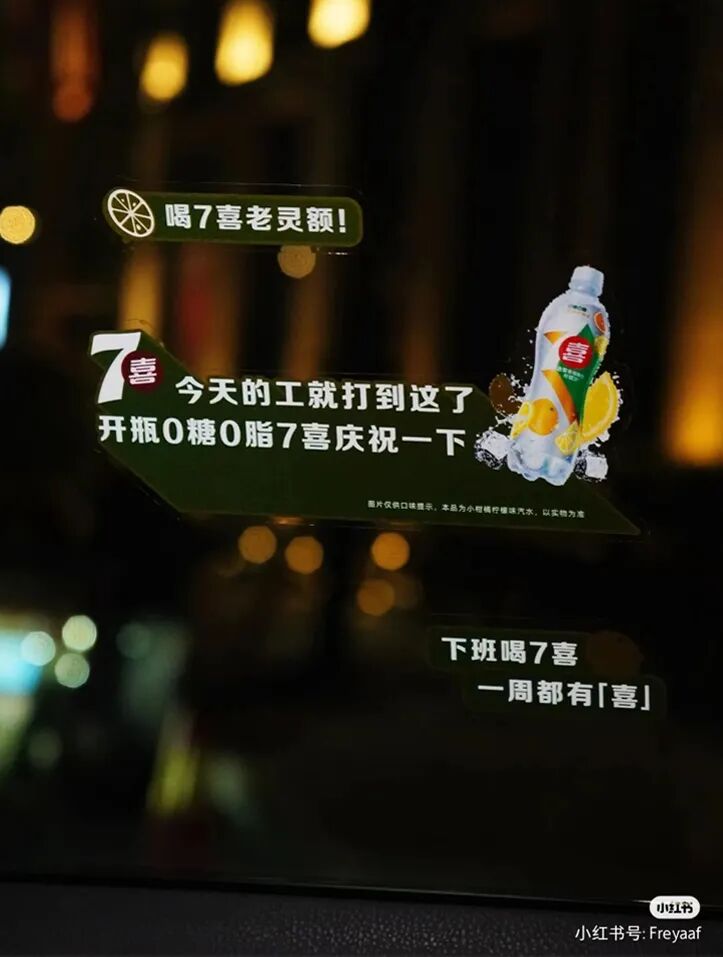 在视觉上,配合彩蛋车的概念,车窗户上被贴上一系列场景文案,如“今天的工就打到这了”、“开瓶0糖0脂7喜庆祝一下”等爽感的文案,摆放了与联名相关的枕头周边等布置巧思,营造坐7喜彩蛋车,享受下班至爽时刻的视觉冲击感。