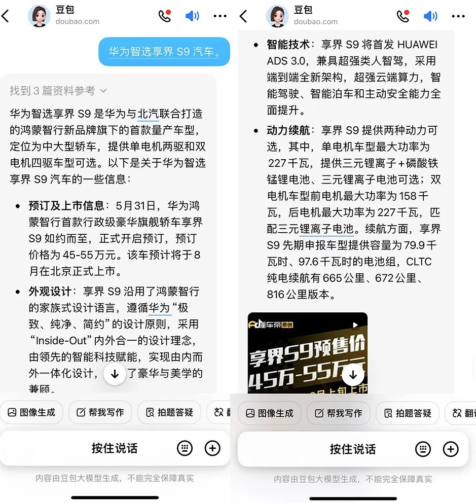 值得夸一夸的还有豆包的无广告模式,例如问豆包“华为智选享界S9汽车”的优势,答案很好地抓取了上市时间、外观设计、智能技术、动力续航等关键点,并提供了相应的视频内容。最关键的是没有烦人的广告,更不会推送二手车资讯,让大家在获取信息过程中不受干扰。