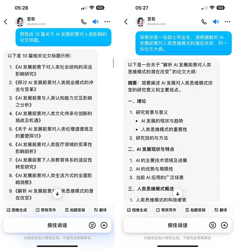 如果以上的问题仅仅是初阶,那么让豆包帮助自己写一份AI方向的论文,算得上高阶难题了,超聪明的豆包果然不会让人失望。当我在脑海中构思出文章方向、框架大纲及输出内容后,向豆包发送:“帮我找10篇关于AI发展前景对人类影响的论文方向后”,并逐步引导它输出。