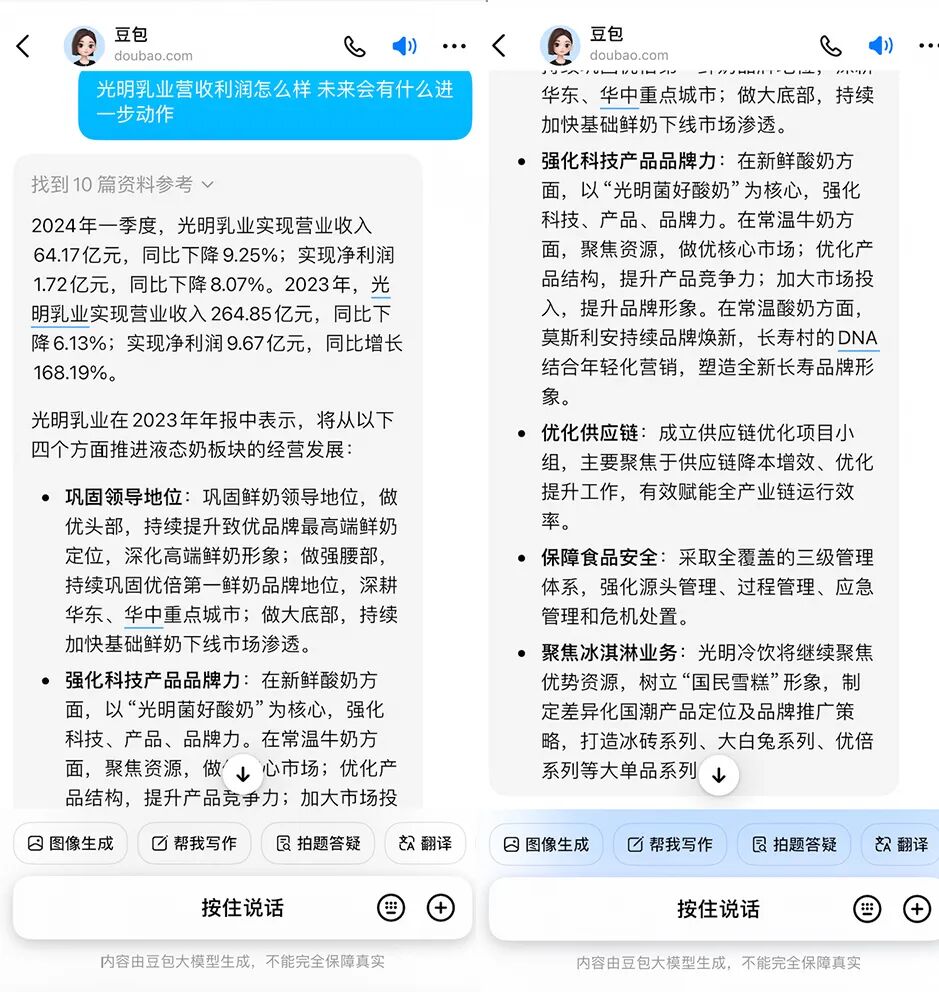 比如我需要一份关于2024年光明第一季度财报总结。在将财报内容发送给豆包后,它就像一位经验丰富的金融精英,不仅迅速提炼出财报的核心,还能转译成通俗易懂的话术,介绍财报内容、企业现状和未来预判。对于核心的词条和观点,豆包还能智能用加粗字体标注出来,方便我们获取更多相关的延展信息。