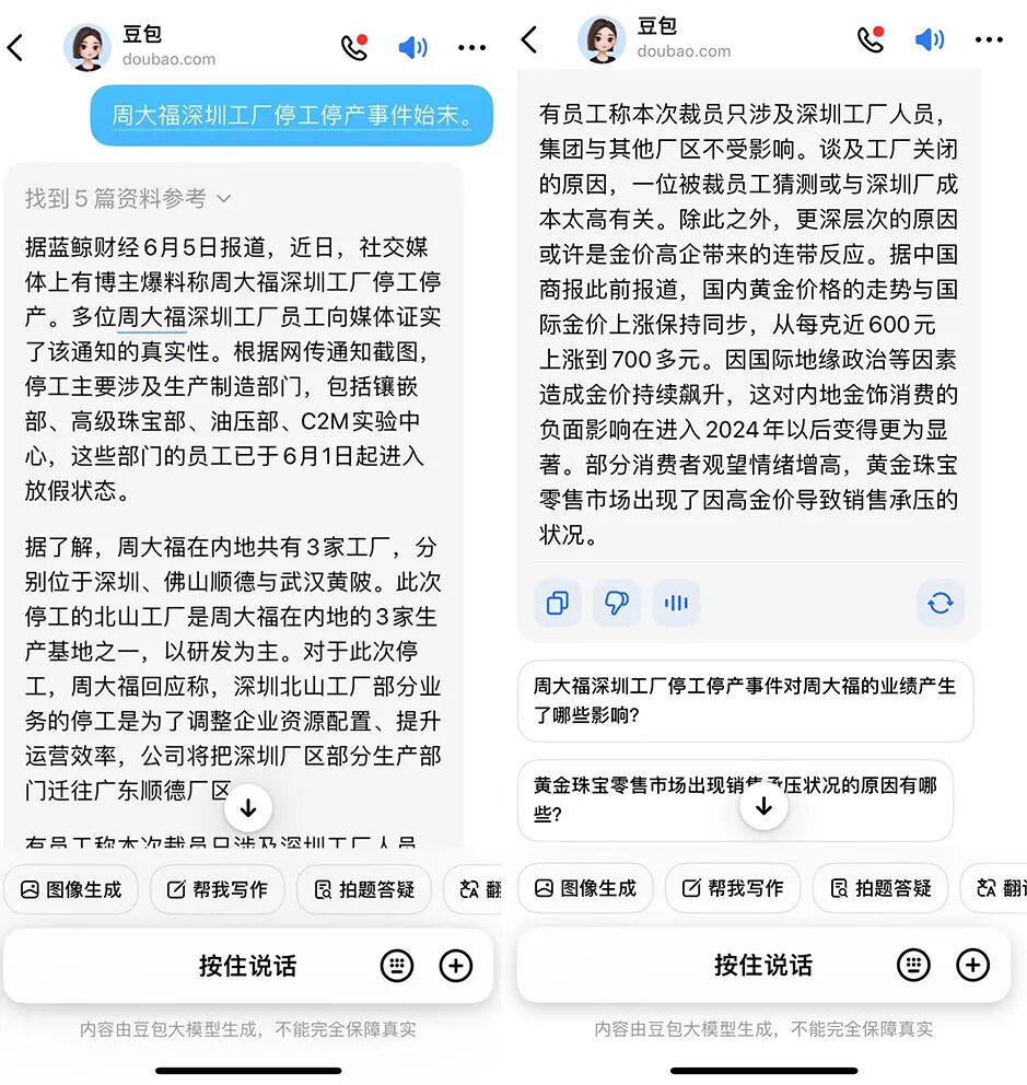 当然,对于让人眼花缭乱的社会新闻,“5G冲浪选手”豆包也不在话下。如,想知道“周大福深圳工厂提供停产事件始末”,直接问豆包就可以了。