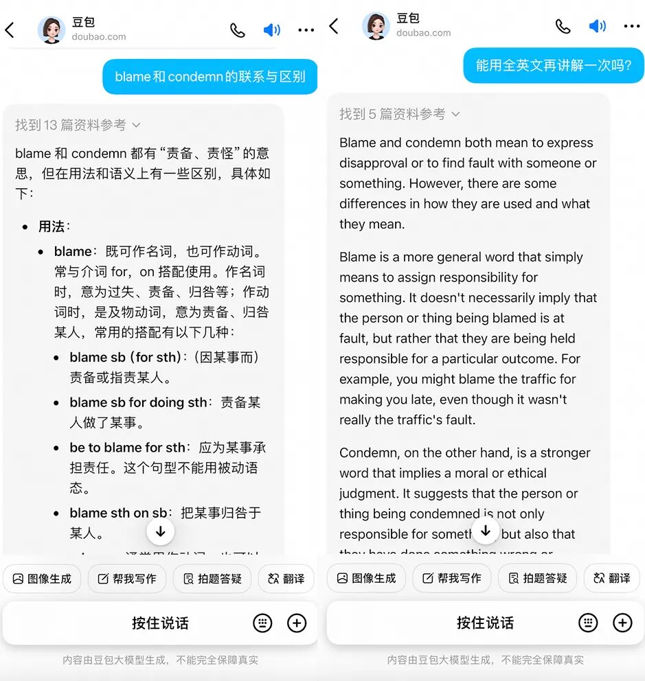 当尝试询问它“blamet”和“condemnt”两词的区别,豆包会详细地讲解两者的区别以及用法,并且回答并不完全是英文,非常适合中国宝宝。通过豆包,还能实现英文周记撰写,大篇幅文本翻译,再不用一点点复制到翻译软件了,简直是英语困难户的福音。