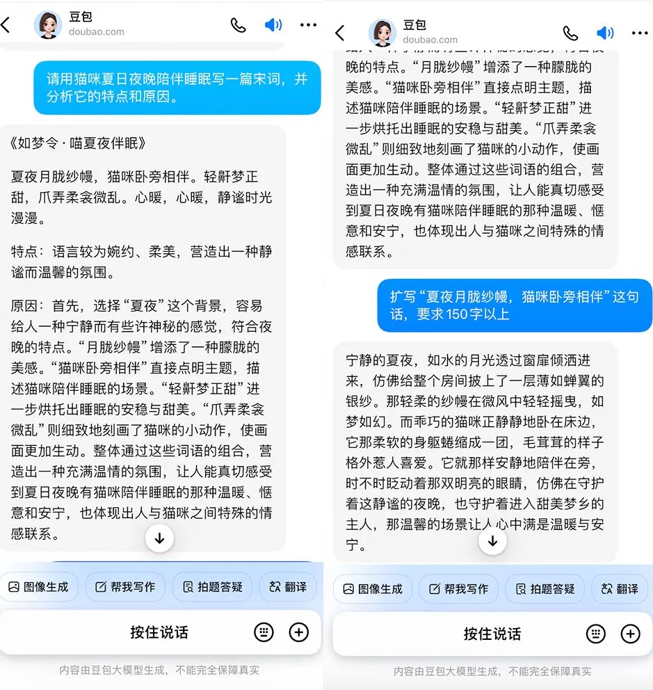 如果在学习过程中遇到问题,豆包也能解决。首先给出了传统项目命题诗,以“猫咪、夏日、夜晚、陪伴为关键词写一篇宋词,并分析这样写的原因”,结果发现,豆包生成了一首《如梦令·喵夏夜相伴》,速度很快,无卡顿,而且称得上“文采斐然”。