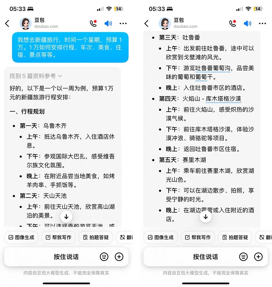 在豆包输入以“我想去新疆旅游,时间一个星期,预算一万,如何安排行程、住宿、美食和景点等。”进行提问,得到的反馈如下。明显看出,豆包回答的精度很高,它根据抖音上的出行攻略视频和互联网平台大神们做的出游计划,所推荐的景点都是很值得一去的地方。