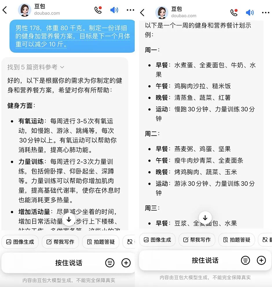 豆包还能充当健身教练,它会根据你的体重目标,自动生成详细健身方案、营养餐方案和饮食方案,细节到每天训练多少分钟,吃多少种类食品,而且还会照顾到不同人群的口味给出不同的饮食选择,既专业又贴心。