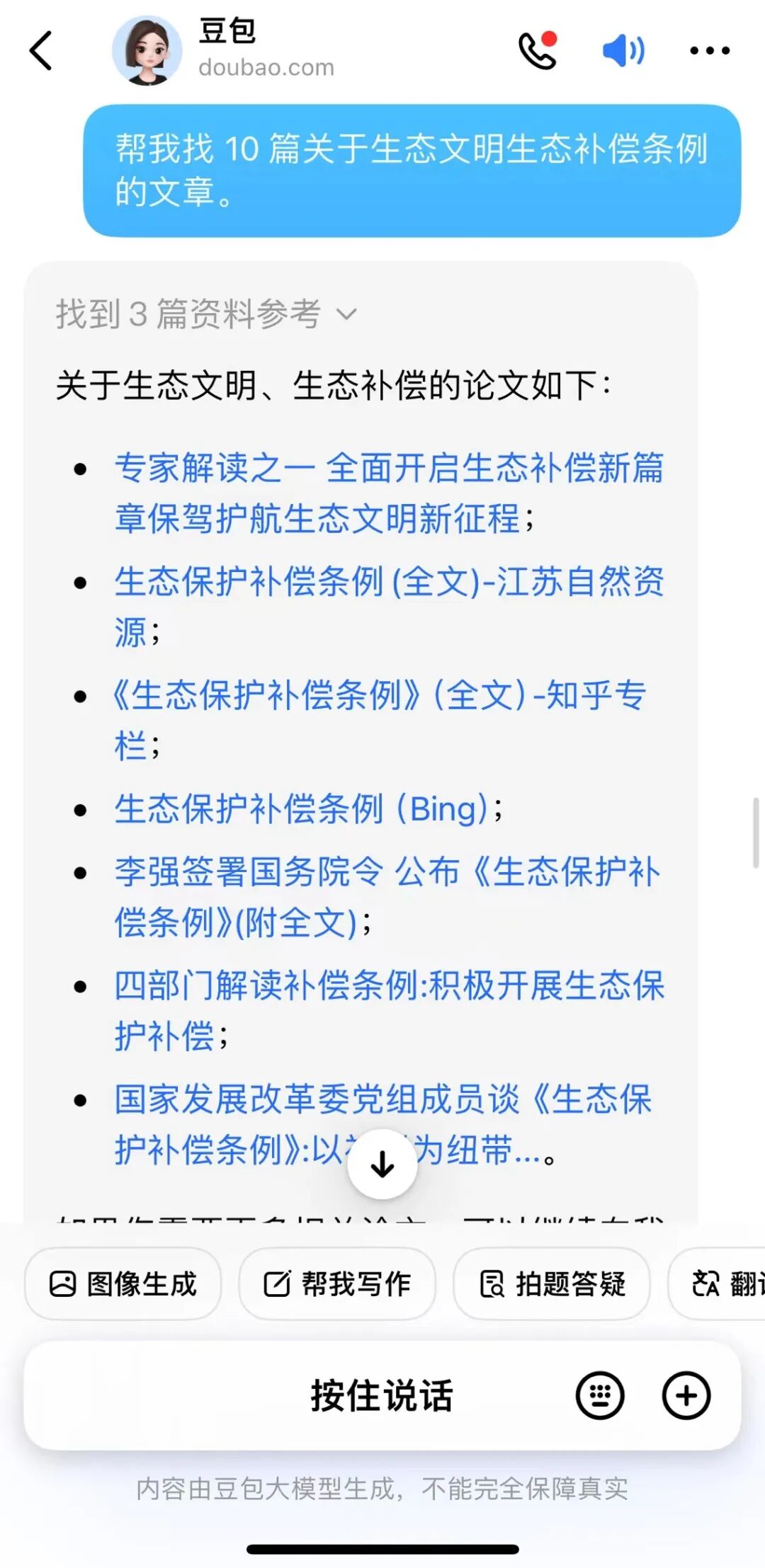 作为一名资深打工人,搜索这份文件的目的,必然是为了撰写生态领域的深度稿件。为了寻找写作灵感,我向豆包发送:“帮我找10篇关于生态文明/生态补偿条例的文章”,仅仅10秒钟,我就得到了10个方向,这是任何人工都无法做到的速度。