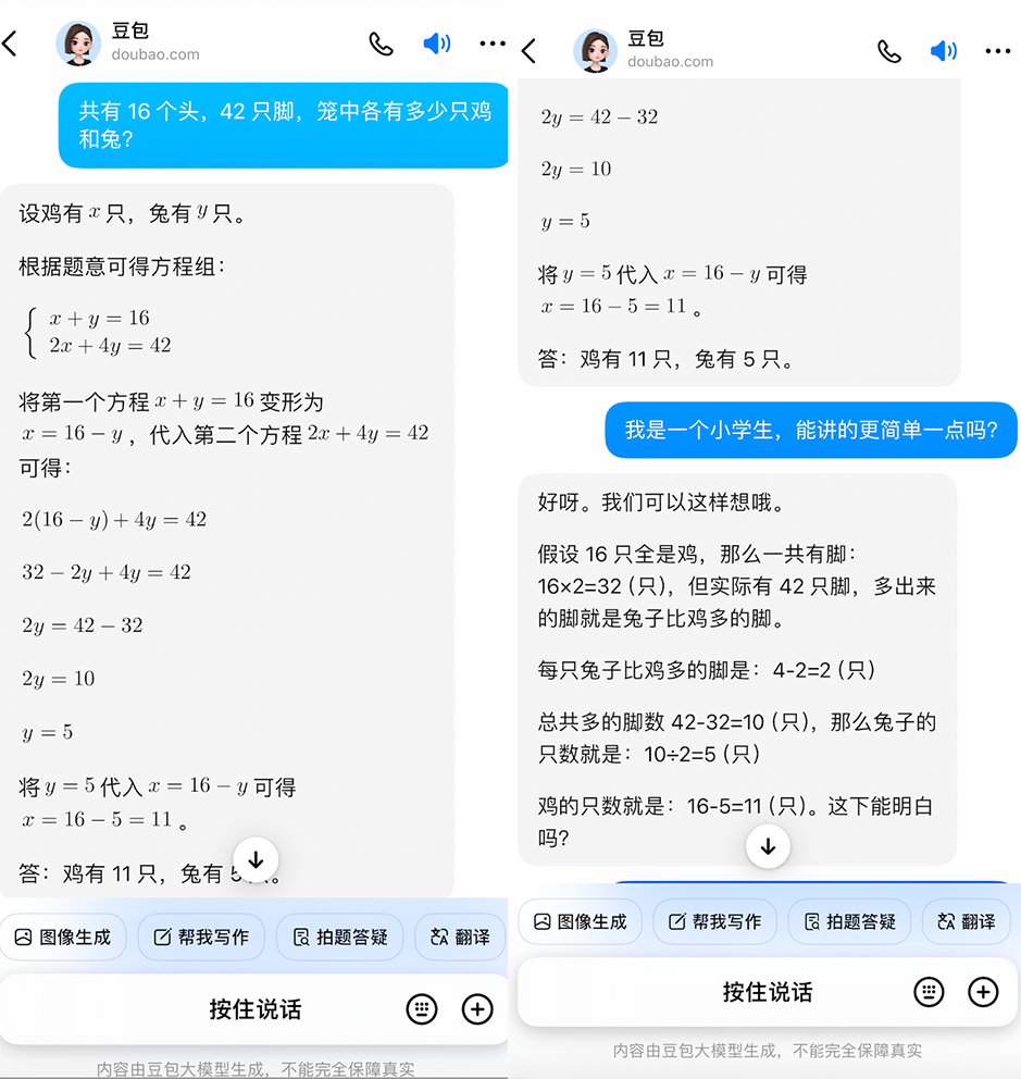 接下来是经典的鸡兔同笼题目:共有16个头,42只脚,笼中各有多少只鸡和兔? 豆包能瞬间给一个很完整的方程解答步骤。