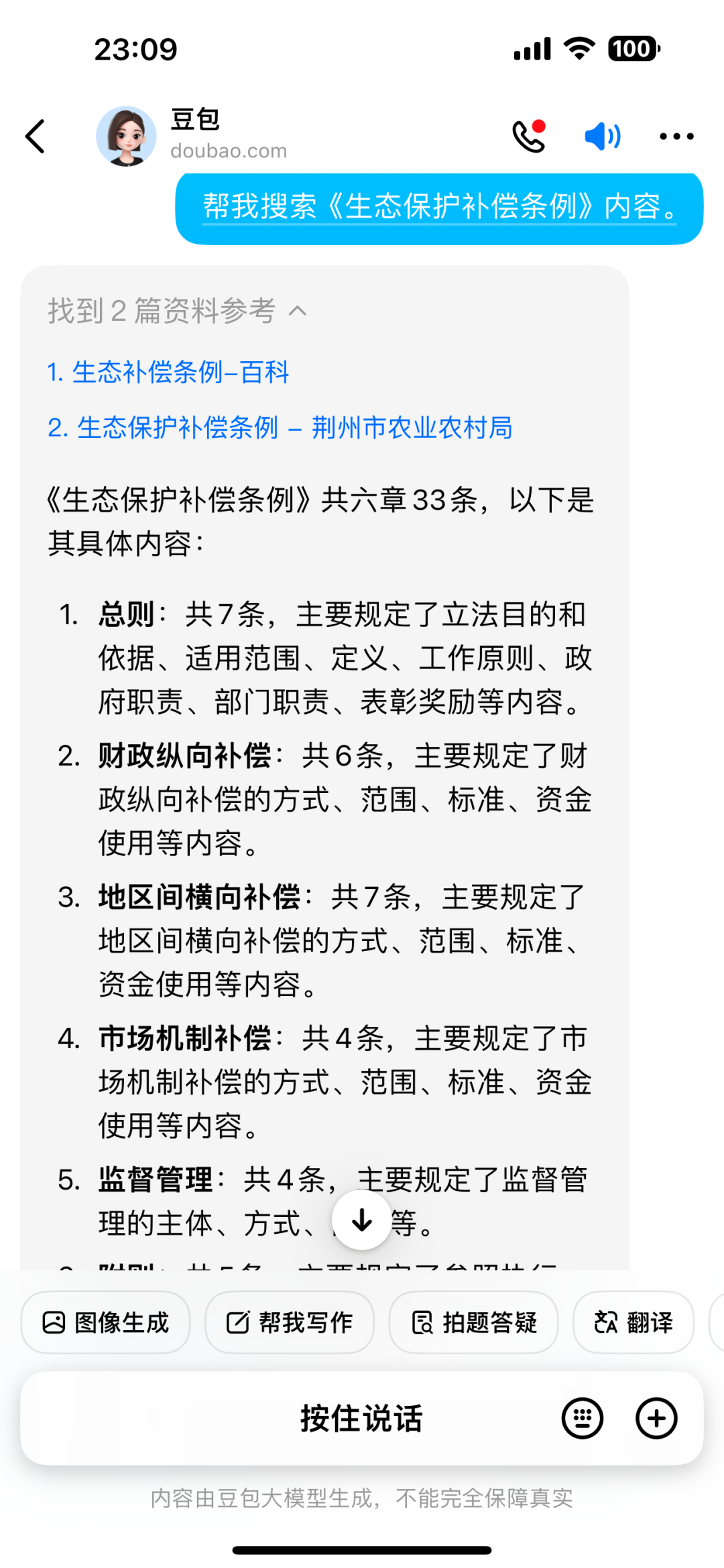 作为一个追根溯源的实时联网搜索助手,豆包在搜索信息的准确性上表现得相当Smart,可以说,专业和靠谱是它的两大关键词。为了测试豆包实时搜索能力,在豆包的聊天界面中,发布了指令“今年6月1日新出台的《生态保护补偿条例》”。发送指令后,豆包在10秒之内整理出了条例的具体大纲和内容概要,同时提供了“百科/荆州市农业农村局”两大信息源,称得上全⾯且⾼效。