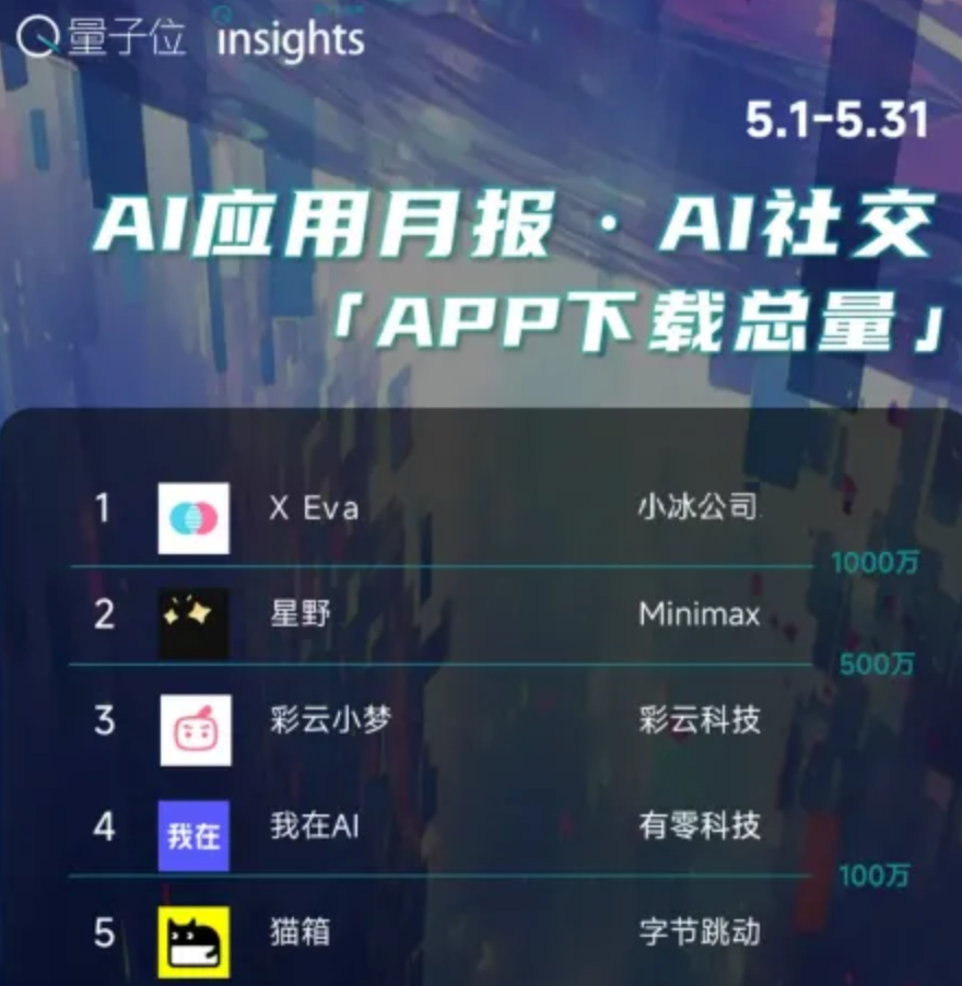 眼下“小黄蕉”刚刚上市,其产品表现尚不明朗,但“猫箱”已有数据可供观察。根据量子位智库发布的《中国AI陪伴5月用户数据报告》:从总下载量来看,市场呈现明显的头部集中效应,强交互和强IP的产品优势显著。截至2024年5月,X Eva以1240万的总下载量稳居第一,成为唯一下载量破千万的产品。星野位居第二,总下载量为890万。第三、四名分别为彩云小梦和我在AI,下载量均在300万以上。之后排名的产品间差距不大,市场地位相对接近,其中“猫箱”位列第五。
