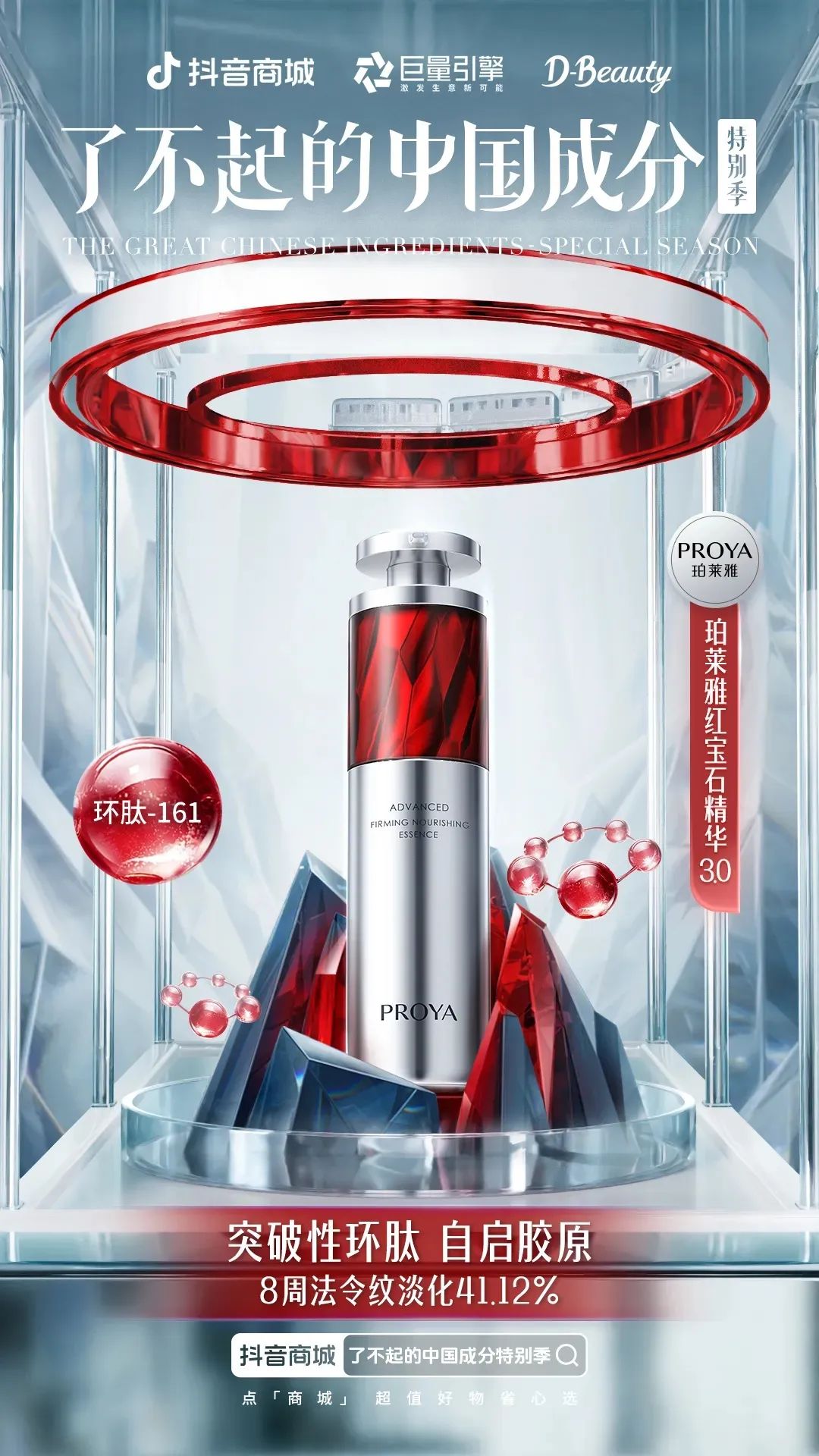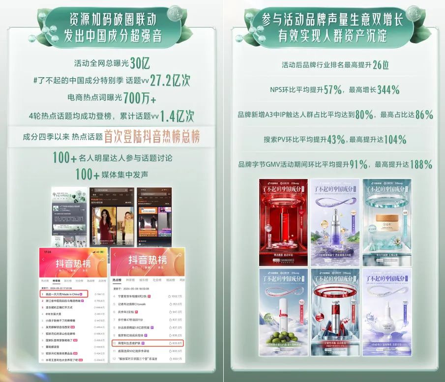珀莱雅不仅注重发挥自身品牌号召力做好科学护肤主题营销,更是借助第三方营销平台的赋能——由巨量引擎打造的国货美妆行业重磅「了不起的中国成分」IP加持自身的科学传播体系化。早在2022年,巨量引擎就推出首个聚焦护肤成分的「了不起的中国成分」IP活动,近期以“了不起的中国成分,让中国品牌华焕新生”为主题,牵手韩束、自然堂、谷雨、薇诺娜、珀莱雅、欧诗漫六大美妆品牌,以“借势平台钻品牌故事+垂类嘉宾联盟下钻科技成分+电商稀缺资源打通后链路”的形式落地。此次活动全网总曝光30亿,其中#了不起的中国成分特别季 话题突破27.2亿次,电商热点词收获700万+的曝光量。在活动中,珀莱雅充分释放「了不起的中国成分」IP的营销势能,借助权威而科学的视角和声音,溯源珀莱雅在「科学配方」的探索之路上,攻克胜肽原料应用难题的过程,以品牌21年科研创新实力成就中国成分“环肽-161”,输出科学护肤的知识,最终传播中国成分与国货美妆品牌,引领中国成分从中国走向世界。