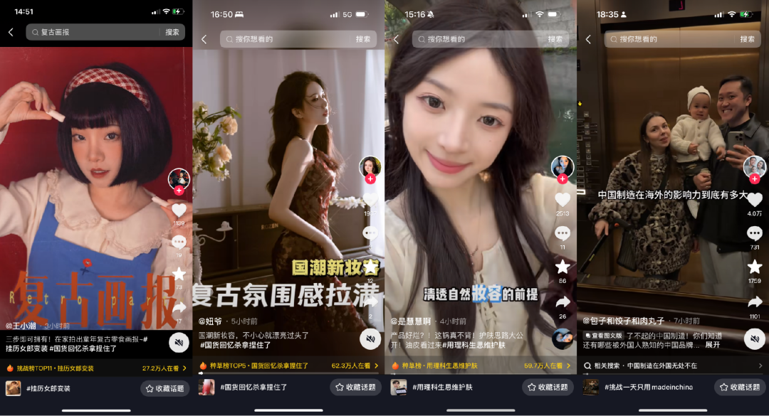 “挂历女郎变装”话题,以挂历女郎变装的形式唤起用户复古回忆;“国货回忆杀拿捏住了” 承接复古情绪氛围,以国货回忆引发老国货情绪共鸣;“用理科生思维护肤”话题邀请专业达人,发布专业的成分种草视频;最后“挑战一天只用Made in China”,邀请海外华人博主和在华外国人博主共创,激发国货自豪感。