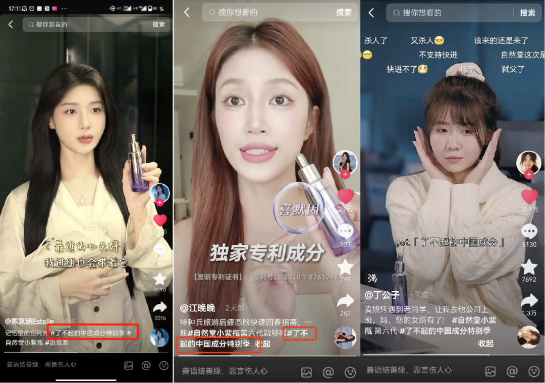 为了实现破圈突围,有效吸引用户注意力,自然堂承接《中国之美》传递的核心主张,借力颜值美妆内容赛道创意,通过“了不起的中国成分”IP,通过巨量引擎联动的30+平台达人共建优质话题,开辟话题营销阵地。