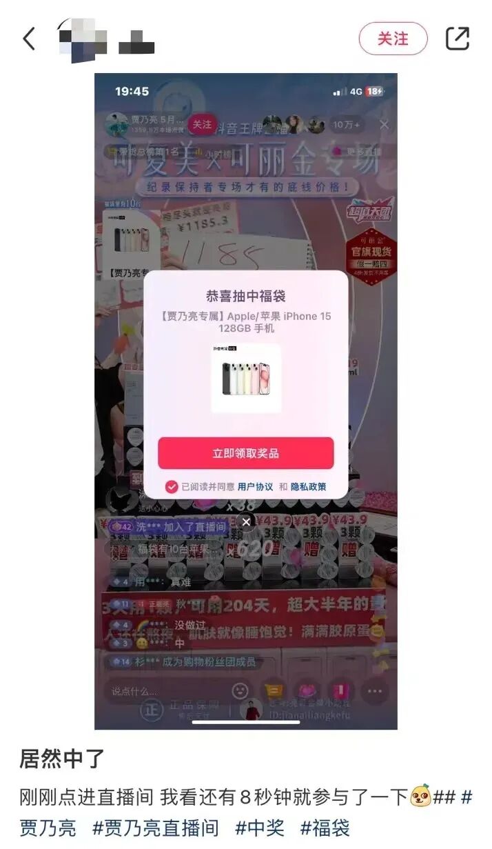 许多用户被补贴机制吸引,在贾乃亮抖音直播间全天蹲守,更是在社交平台积极分享抢红包、薅羊毛的“战绩”。