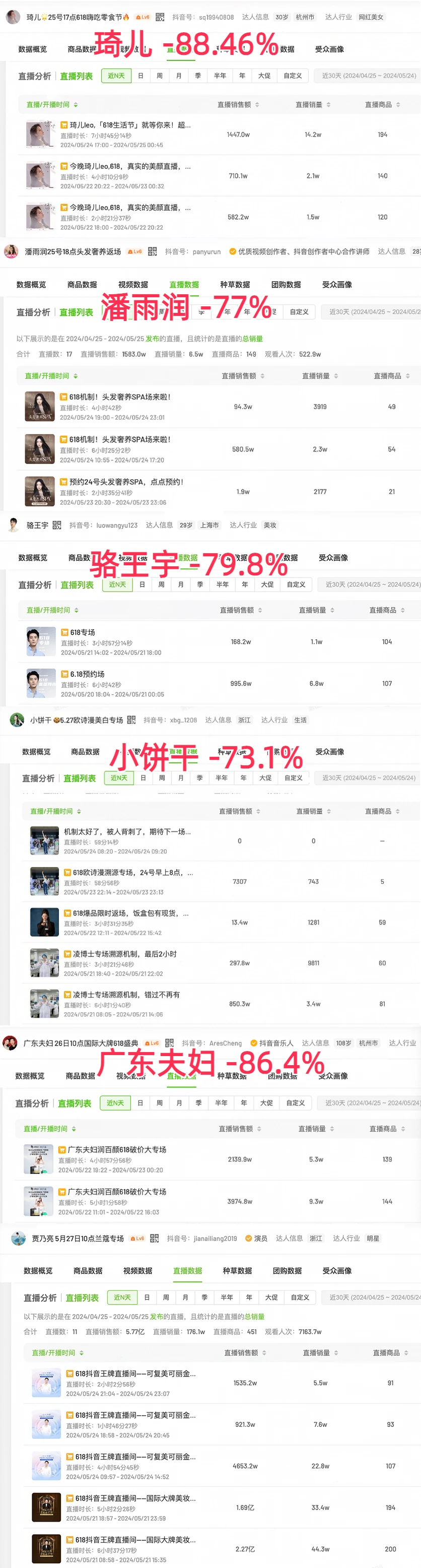 根据飞瓜数据,同样是在618首播的成绩:抖音的广东夫妇,去年成交额4.5亿,今年6114万,同比下跌86.4%;琦儿,去年1.11亿,今年1292.3万,跌88.46%;潘雨润,去年2952.9万,今年674.8万,下跌77%……