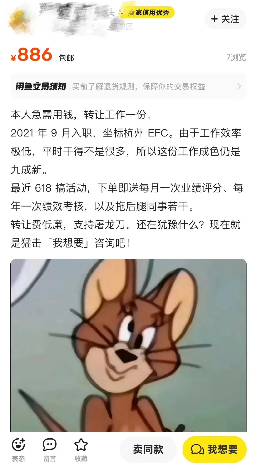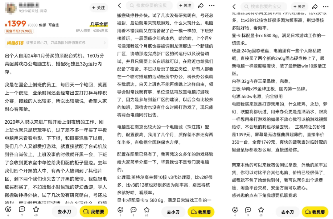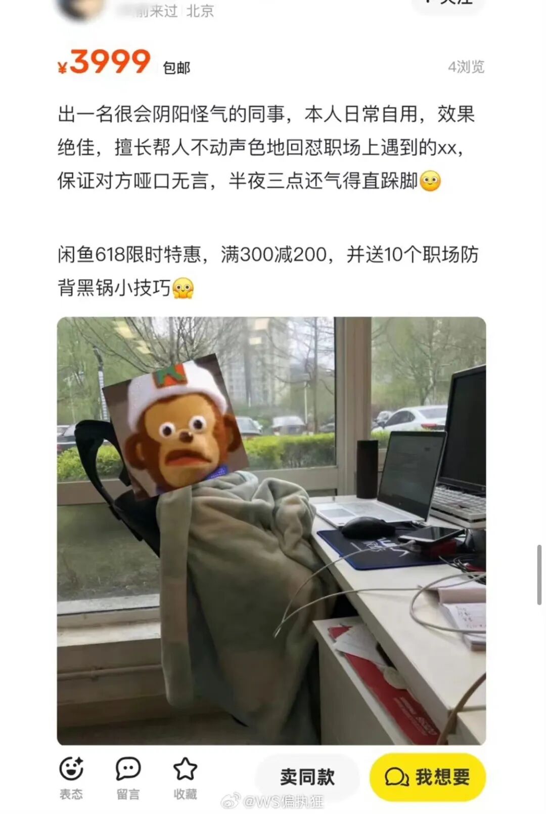平时上闲鱼,挂售的是二手物品,小家电、数码产品、不穿的衣服;这几天上闲鱼,挂售的是同事,爱抬杠的老板,脾气不好的财务,阴阳怪气的同事……