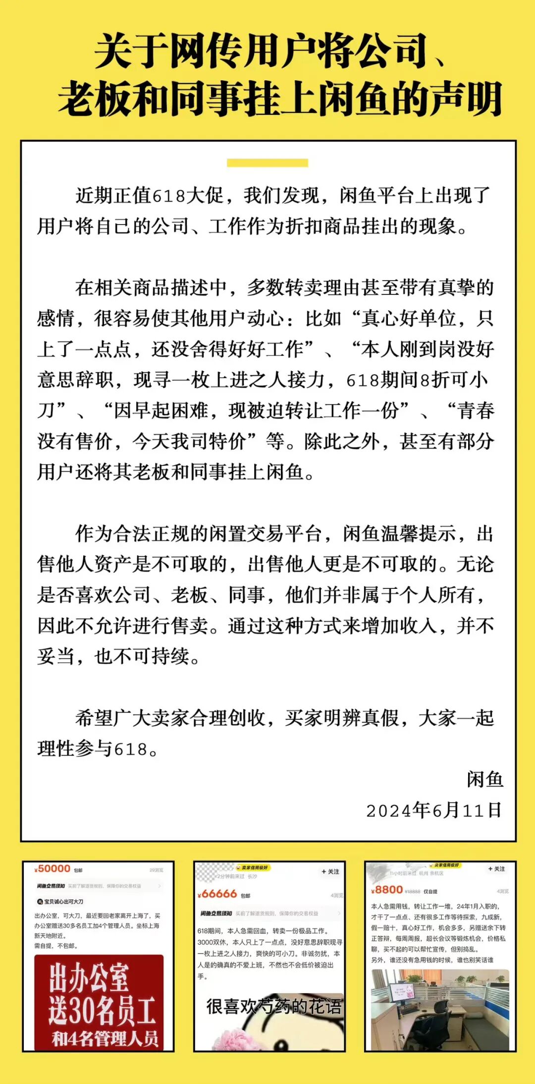 6月11日上午,闲鱼发布公告对此事进行了回应。在公告中,闲鱼首先称赞了卖家们带着“真挚的感情”,但是“出售他人”和“他人资产”是不可取的,这种收入“不妥当也不可持续”。