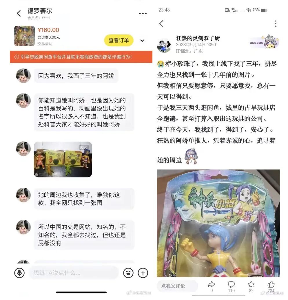 再比如这位买家,是《神兵小将》阿娇的粉丝,她想拥有一款阿娇手办,寻找多年终于找到,她向卖家讲述了找寻过程。