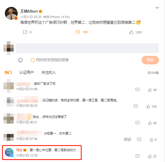 有网友评价:“海信世界杯这个广告很巧妙啊。世界第二,让我突然想查查它到底啥第二?”