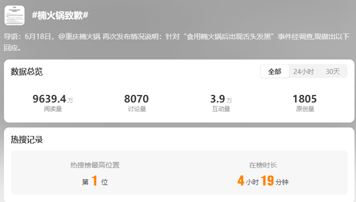 在今日(6月19日)凌晨,楠火锅在官方微博公布了对此事的调查结果,称经浙江国正检测技术有限公司检测,消费者反映的涉事门店同批次产品符合国家标准,不存在亚硝酸盐超标的问题。
