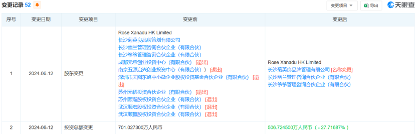 据天眼查信息显示,6月12日,茶颜悦色关联公司湖南茶悦文化产业发展集团有限公司发生工商变更,包括顺为资本在内的多家投资机构退出股东行列,公司注册资本也由原来的701万减少到506.7万。