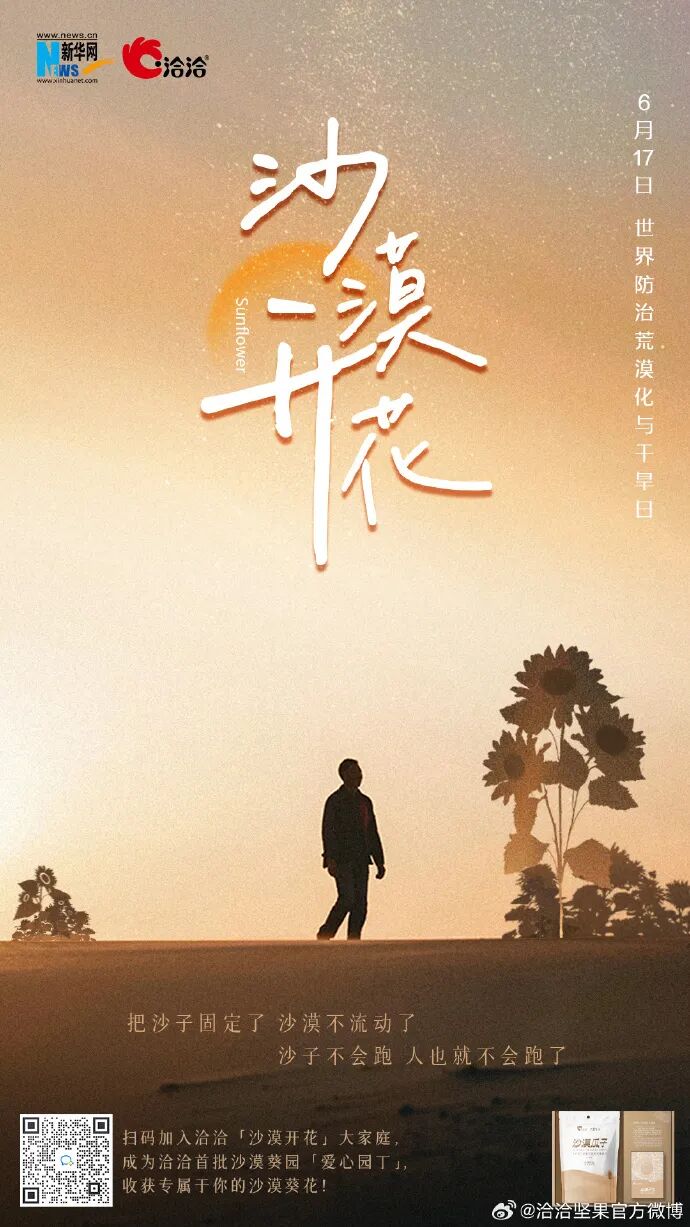 “把沙子固定了,沙漠不流动了;沙子不跑了,人也就不会跑了。”现在加入洽洽「沙漠开花」大家庭,有机会成为洽洽首批沙漠葵园「爱心园丁」,收获专属于你的沙漠葵花。