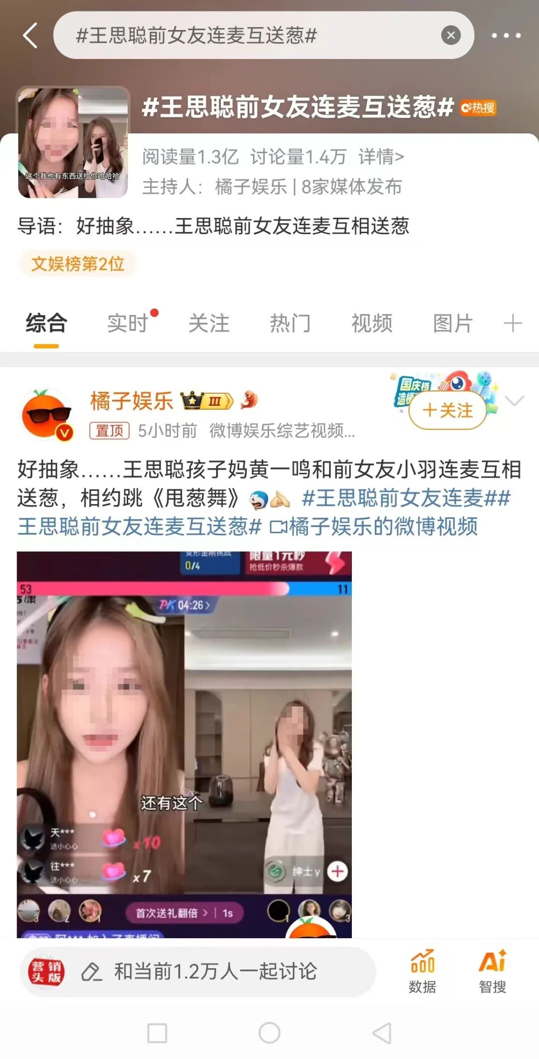后续更为魔幻的是,自爆此事的博主,与王思聪刚分手的前女友连麦搞起了在线真·撕葱直播。