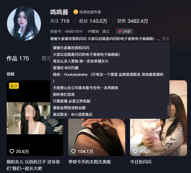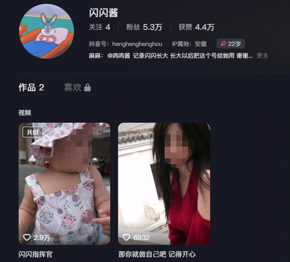打得一手好算盘的黄一鸣,甚至给自己孩子(取名为闪闪)开通了抖音账号,简介里写道“记录闪闪长大,长大以后把这个号给她用”。