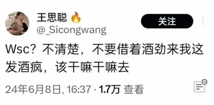 随后,一个疑似王思聪的社交媒体账号回应了关于此事的传闻,发帖:“Wsc?不清楚,不要借着酒劲来我这发酒疯,该干嘛干嘛去。”