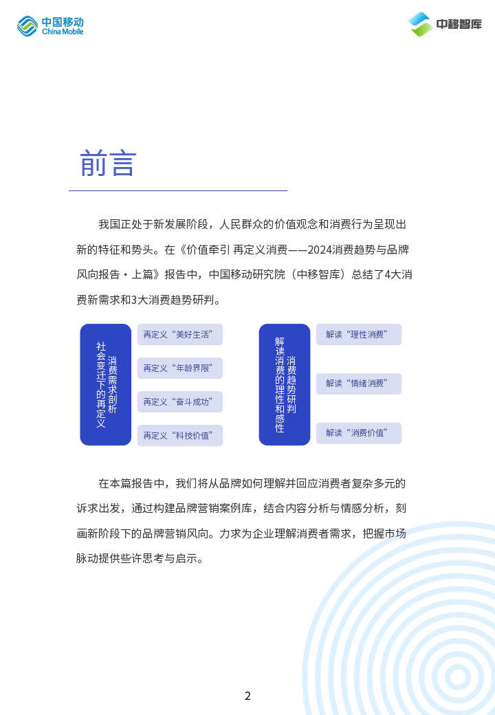 随着2024年社会经济环境的不断演变,消费市场也正经历着深刻的转型,消费者的观念与行为呈现出多元化和个性化的新趋势。中国移动研究院(中移智库)发布的《2024消费趋势与品牌风向报告·下篇》深入分析了这一变革期的品牌营销策略,旨在帮助企业洞察并顺应消费者需求,激发品牌活力。