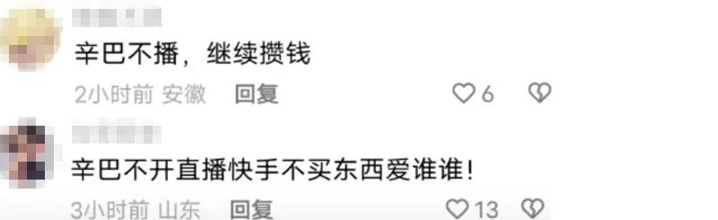还有不少人表示只认辛巴“辛巴不播,继续攒钱”“辛巴不开播快手不买东西爱谁谁!”