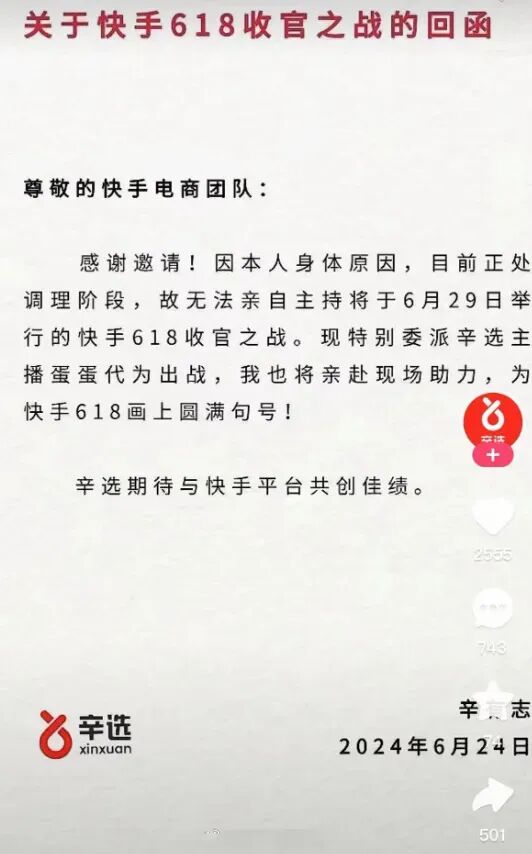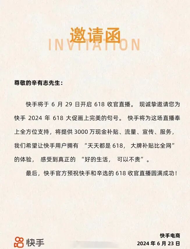 快手的邀请函是通过快手官方账号“快手小店”公开发出的。在邀请函中,快手宣布将于6月29日举办618大促的收官之战,并诚挚邀请辛有志作为压轴嘉宾,为这场年度电商盛宴画上完美的句号。