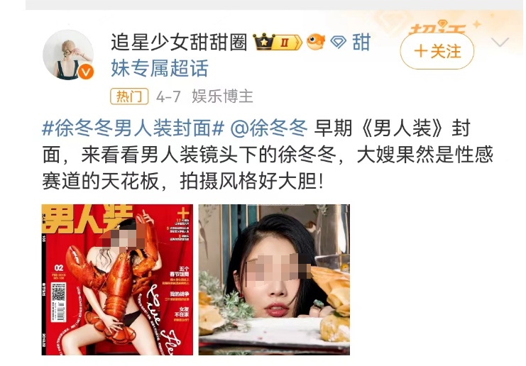 徐冬冬就在微博为椰树发声,分享老挂历上泳装美女美,大大方方表态不用给自己打码。