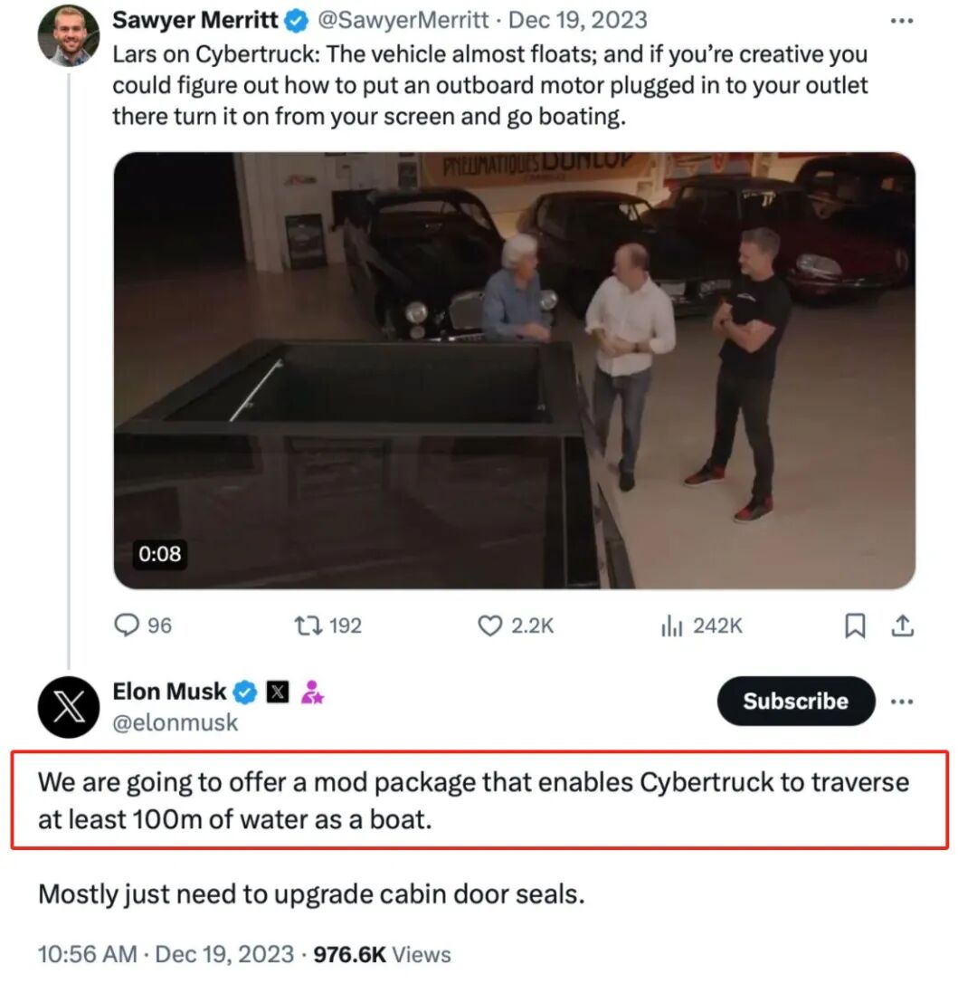 马斯克曾表示,特斯拉Cybertruck可以当船使。当然,特斯拉官方并未承认特斯拉Cybertruck具有“开船”的资格,但部分特斯拉Cybertruck车主进行了涉水测试。