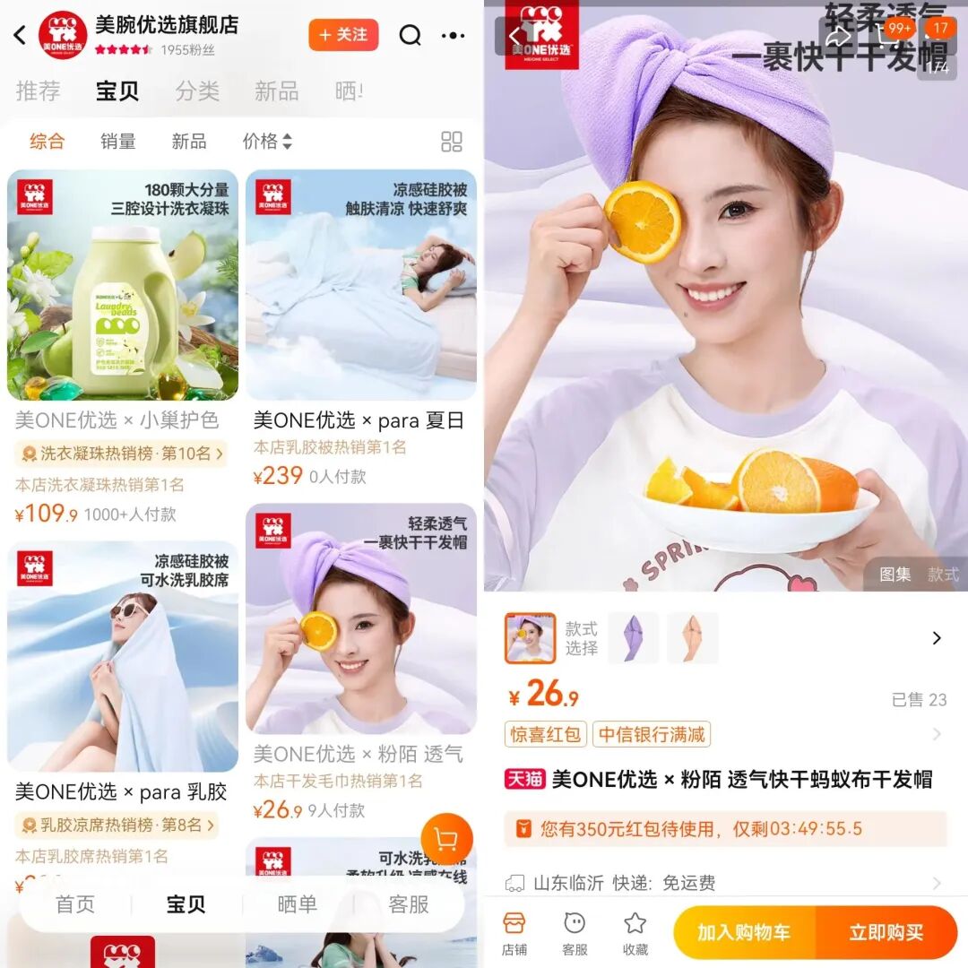 截至6月20日晚上八点,美腕优选旗舰店共有1955名粉丝,共上架五件商品。其中,登上李佳琦直播间的洗衣凝珠售出2000多件,而硅胶被和乳胶凉席则售出600多件。另外三个并没有登上李佳琦直播间的商品链接,只有一款售价26.9元的干发帽售出23件,其他两个链接显示销量均为0。