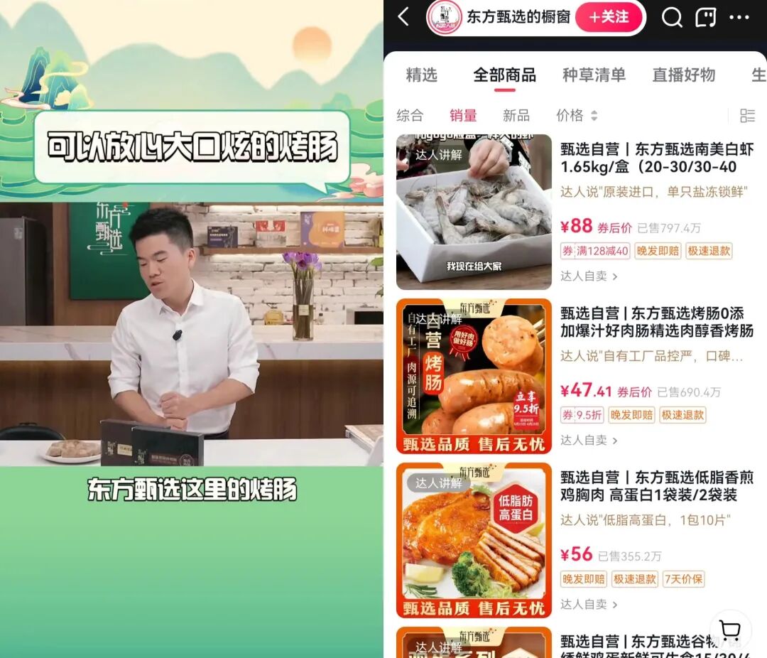 各头部主播自有品牌的定位也颇有不同。辛巴和小杨哥的直播间定位“接地气”,自有品牌的定位也偏下沉;东方甄选靠着“知识带货”走红,主打生鲜产品,客单价不低,但依旧吸引到消费者。