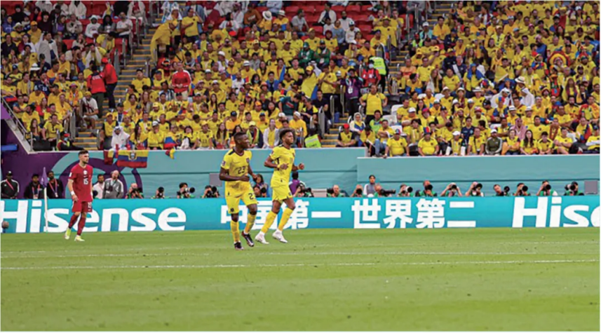这个过程中,“Hisence”的品牌Logo也屡次出现在全球顶级赛事的绿茵足球场上。其中最令人印象深刻的画面之一,是2022年的卡塔尔世界杯上,海信“中国第一 世界第二”的亮眼口号。