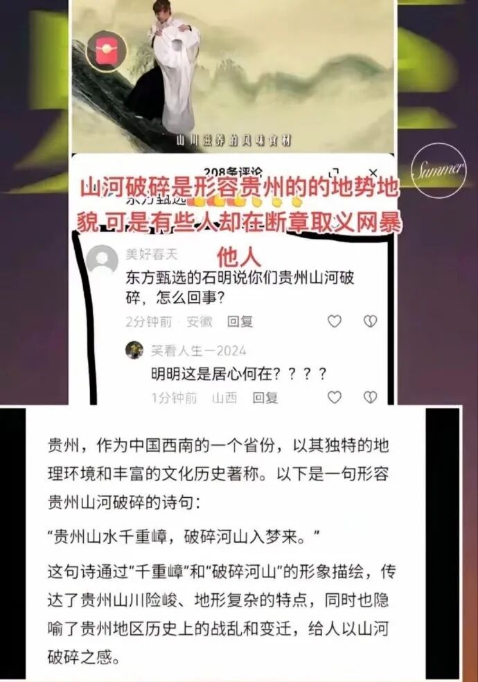 但也有东方甄选的粉丝替明明打抱不平,认为这里的山河破碎只是单纯形容地貌,要结合上下文语境来理解,不要动不动就上纲上线。