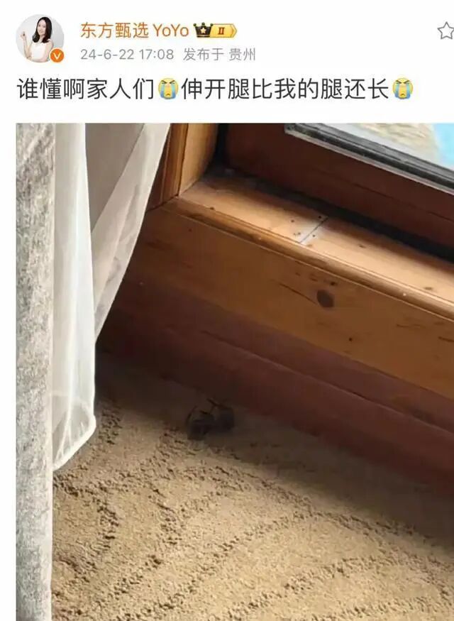 6月22日,东方甄选主播YOYO在直播时说道,她在房间里发现了一只蜘蛛,蜘蛛的腿比她的腿还长。为了证实自己所言非虚,她还拍照发了一条微博(目前已删除),称:“谁懂啊家人们[流泪]伸开腿比我的腿还长[流泪]”。