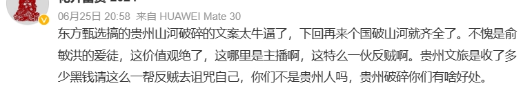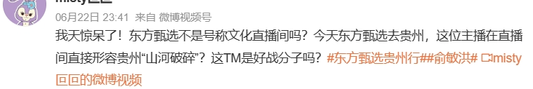 与此同时,另外一位东方甄选女主播则被网友爆料“称贵州为穷省”,也很败好感。
