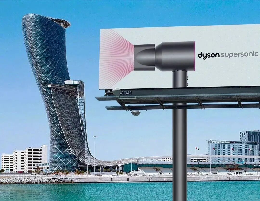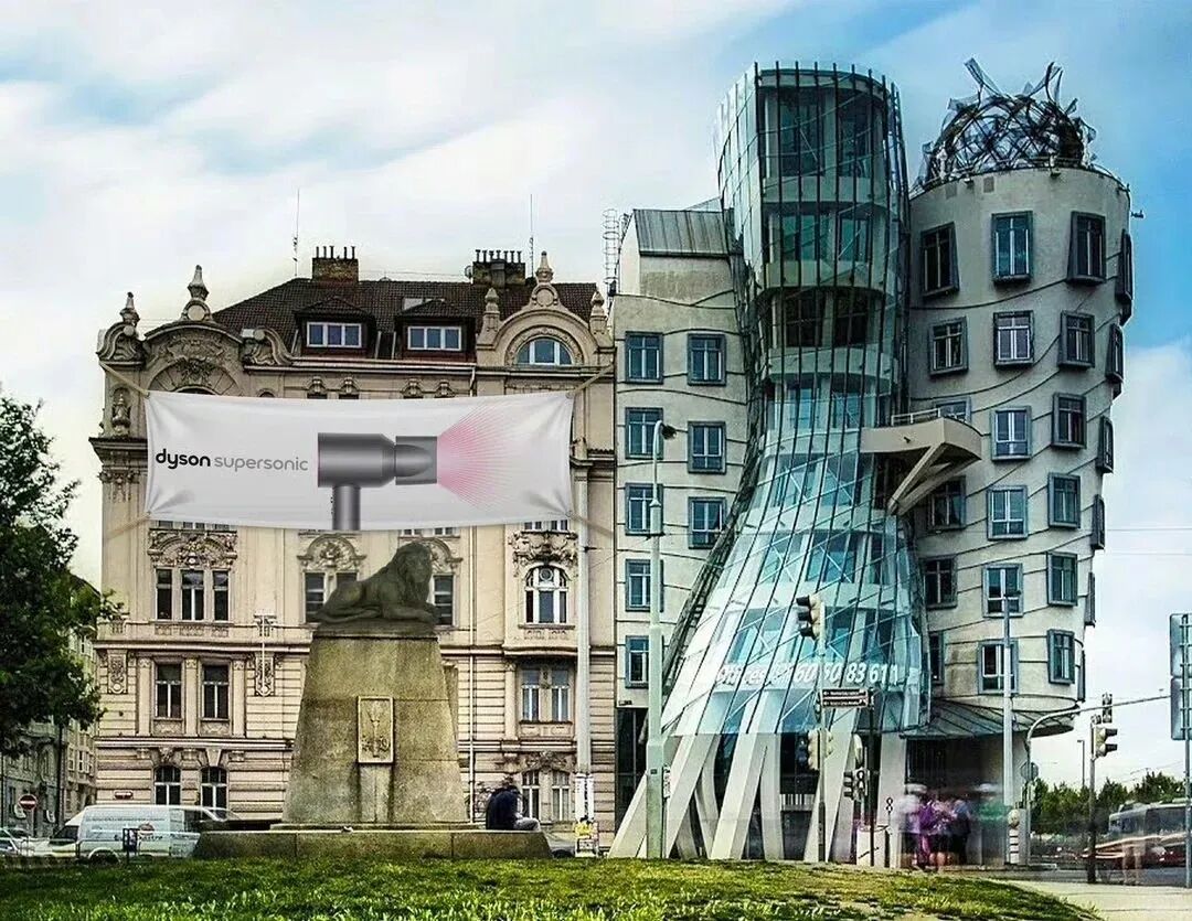 戴森在世界多处著名的倾斜或扭曲建筑旁放置了巨幅吹风机广告海报,视觉上传达出其风力的强大,有趣的创意!