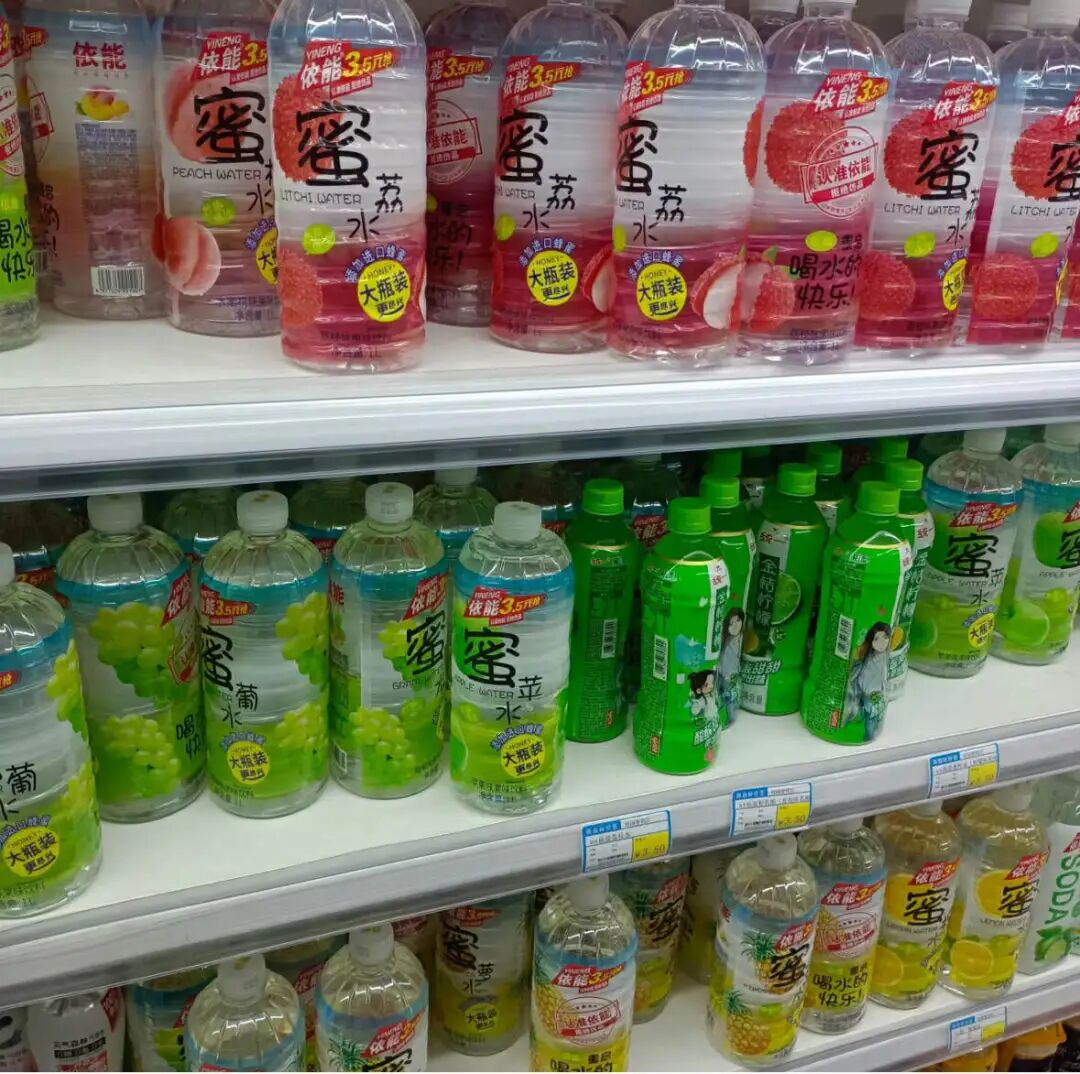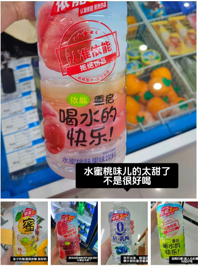 目前最出圈的是这款外表颇像三得利“沁x水”之兄弟版的“蜜x水”,瓶身都是透明圆柱形,画着对应色系的水果包装纸远看很难分清谁是大哥谁是弟弟;味道也类似——“沁x水”的主打味道几乎被依能完美学习,还有一些创新味道如椰子和乳酸菌等。