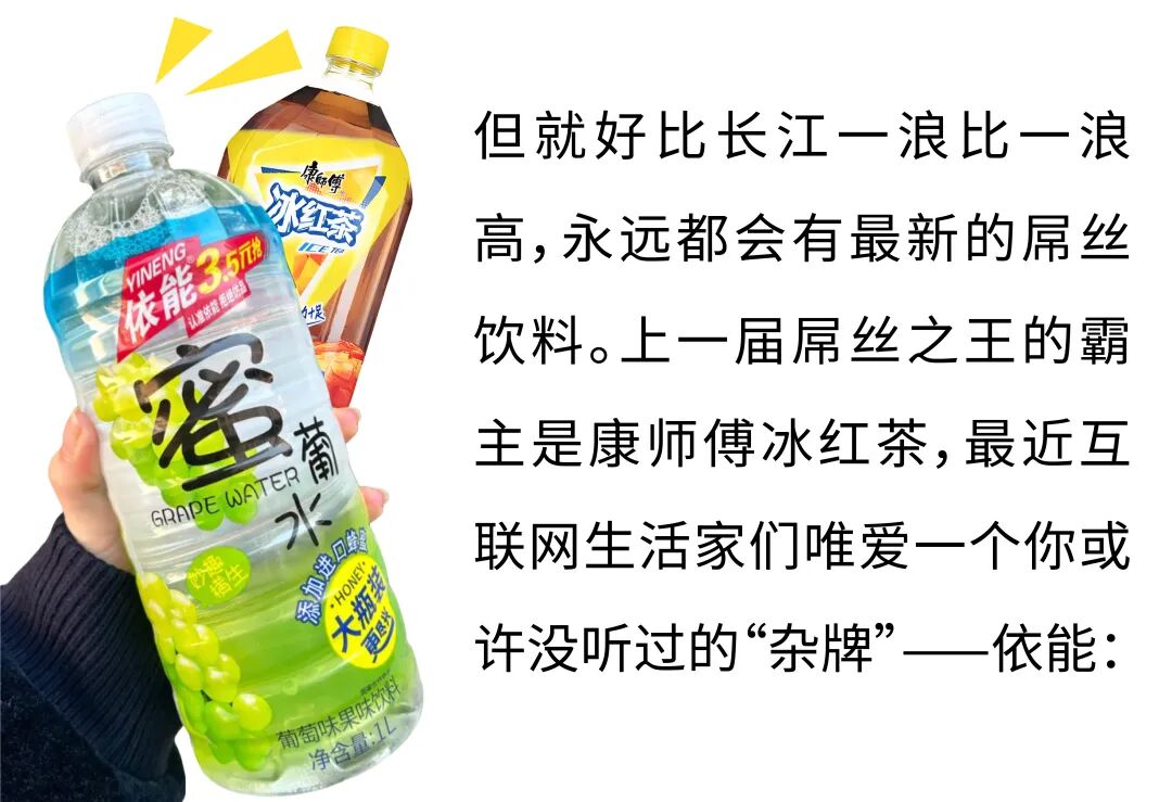 屌丝饮料们越是眼红中产饮料的生财之道,越是增强了打工人的背离感。这时候你能在依能上看到众多饮料的影子,但就凭它还在卖3块5并且没有下限的屌丝饮料,已经足够稀罕。