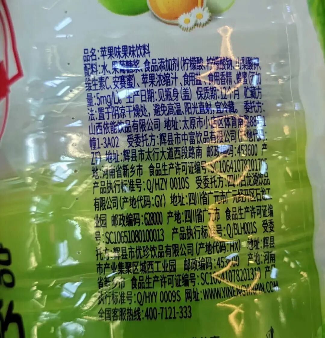 如果你仔细看配料表就会发现,除了常见的浓缩果汁和食用香精,依能屌丝饮料里还有让中产见了闻风丧胆的安赛蜜(过量食用对身体产生负担的甜味剂)。