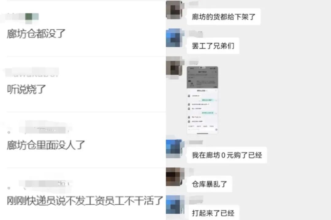 在网传的版本中,“罢工”“0元购”“烧了”等字眼屡屡出现在所谓“爆料者”的聊天页面中,各种“现场暴乱”图满天飞。